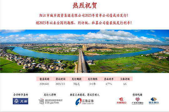 2024年1月19日,市城投集團(tuán)在深圳證券交易所成功發(fā)行“陽(yáng)江市城市投資集團(tuán)有限公司2024年面向?qū)I(yè)投資者非公開(kāi)發(fā)行公司債券”。本期債券發(fā)行規(guī)模為5.5億元,期限為5(3+2)年,票面利率3.10%,全場(chǎng)認(rèn)購(gòu)倍數(shù)超過(guò)4.8倍,是...